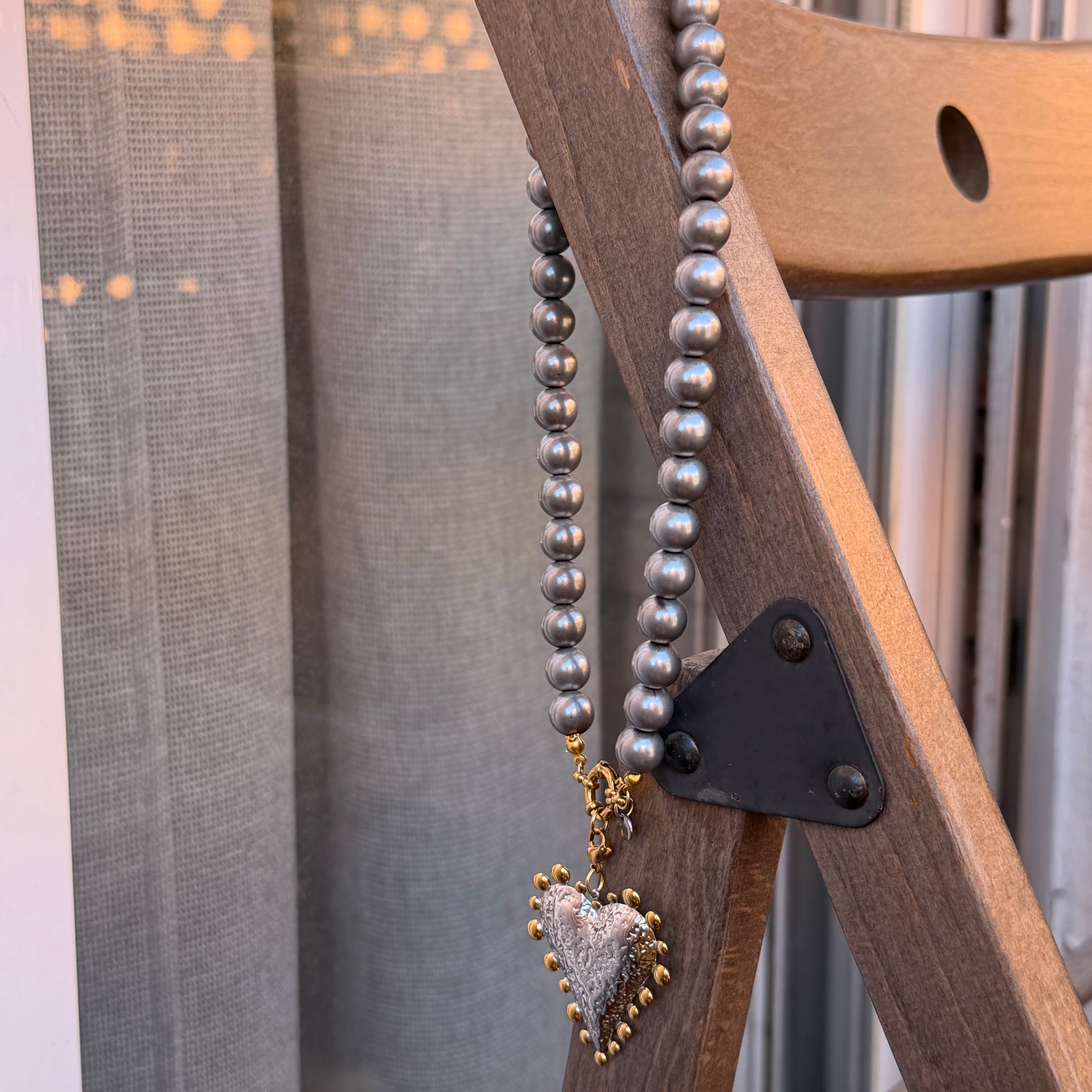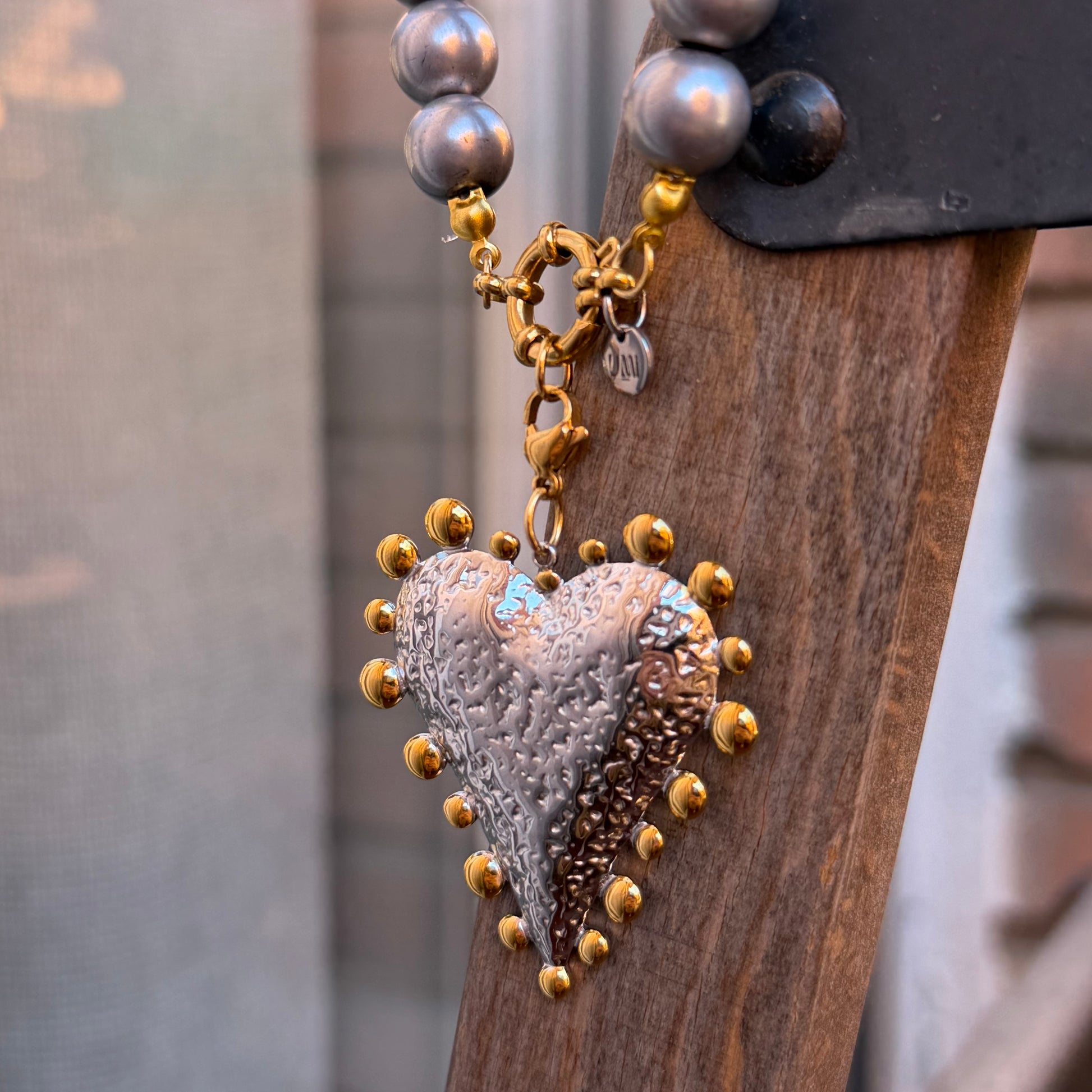 Collar hecho a mano con bolas minerales y charm en forma de corazón.
